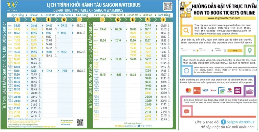 여행을 시작하려면 “Saigon Waterbus” 공식 웹사이트에서 티켓을 예매하거나, 항구에서 바로 구매할 수 있어요. 시원한 강바람 과 넓은 공간에서 편안한 여행을 즐길 수 있는 워터버스는 도시의 소음에서 벗어나고 싶은 사람들에게 완벽한 선택이에요